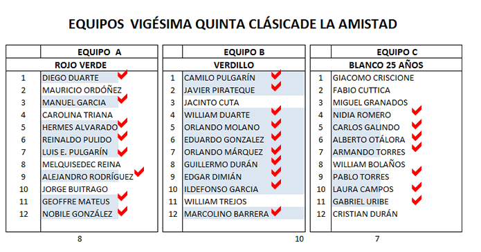 Según estos datos oficiales el ganador indiscutible de hoy es el equipo Verdillo pues Javier Pirateque venció a sus duros competidores Diego y Camilo. Un segundo lugar para los Rojos. La divisa Blanca alcanzó un honroso tercer lugar.