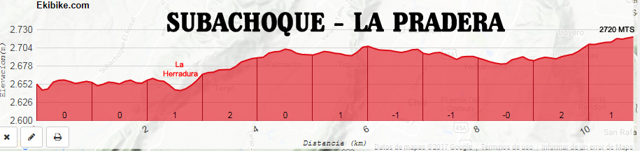 Nos reagrupamos en Subachoque y retomamos el camino a la Pradera. Este recorrido de casi once kmts, que lo hemos hecho varias veces en pruebas contrarreloj fue el escenario propicio para que cada uno tuviera la oportunidad de medirse. Tiene su grado de dificultad por tratarse de un terreno totalmente quebrado plagado de repechos algunos cortos pero exigentes, como el aperitivo, la subida denominada la herradura de menos de 150 metros pero que tiene una pendiente máxima del 8.8%. .