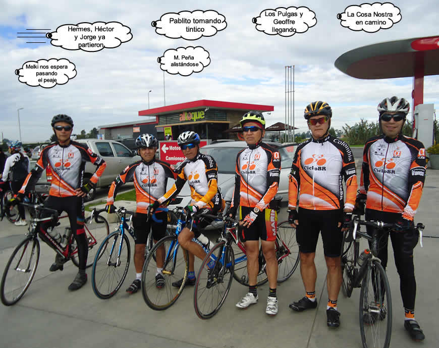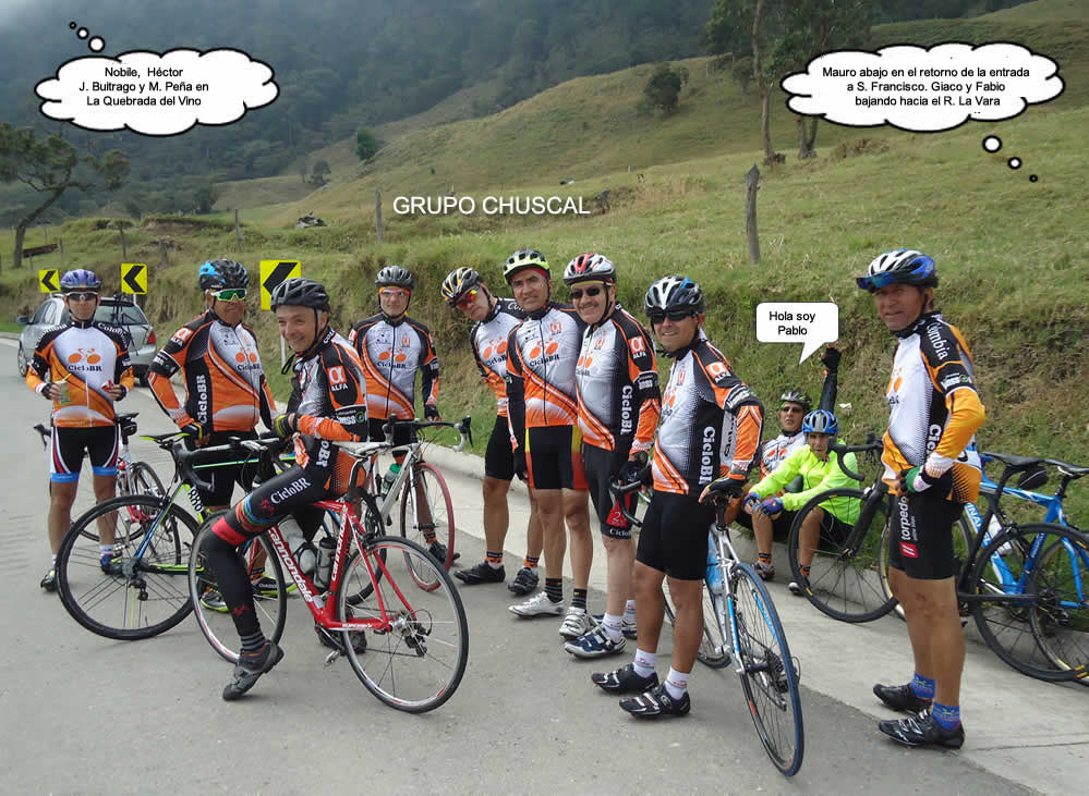 En la mitad del emparedado estábamos once pedalistas quienes bajamos hasta el Chuscal: Víctor y O. Molano, Pablito, O. Márquez, Hermes, A. Otálora, W. Duarte, Pulga, Melki, Geoffre y Eduardo.