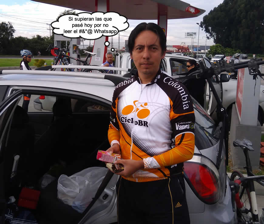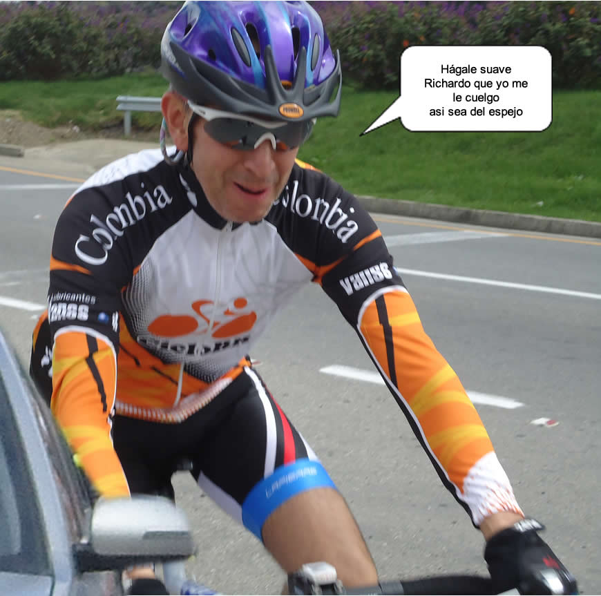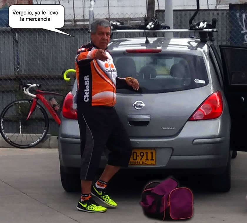 Nos acompañó en su vehículo Ricardo, venga les cuento la que le pasó hoy, también tuvo un día difícil. Pasadas las seis de la mañana buscó sus implementos, recordó que la semana pasada había leído en la programación que hoy tocaba la camiseta Negro Naranja pero no estaba seguro, montó la bici en el auto y cuando estaba a punto de partir decidió revisar la programación, tenía razón era la naranja, pero entonces descubrió con angustia que hoy tenía turno de conductor,” …erda”, que vaina lo primero que se le ocurrió fue pasar por la plaza de mercado de Fontibón, le queda cerca, allí compraría unos gajos de buenos bananos y otras fruticas para sus compañeros. Pero la plaza hoy estaba cerrada, me llamó angustiado, le dije que no se preocupara que lo importante era su acompañamiento. Pero el León del Tolima no se dio por vencido, se fue buscando en el camino hasta que encontró un supermercado abierto, allí hizo un mercadito de galletas, bocadillos y juguitos de caja. Oiga Richard Ud. es un bacán qué ejemplo de solidaridad con sus compañeros, anótese 100 puntos. Que Dios le pague, nosotros andamos cortos de billete.