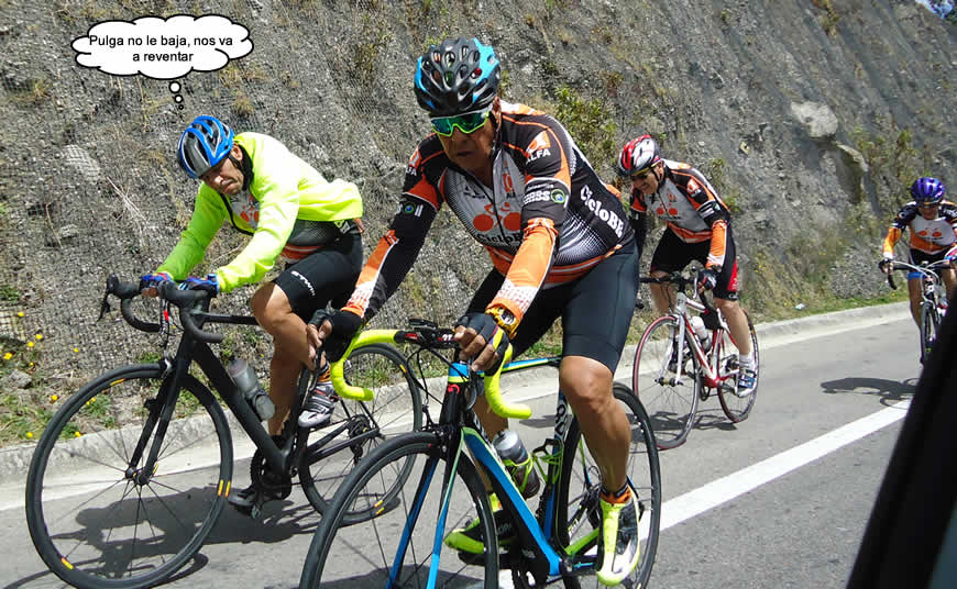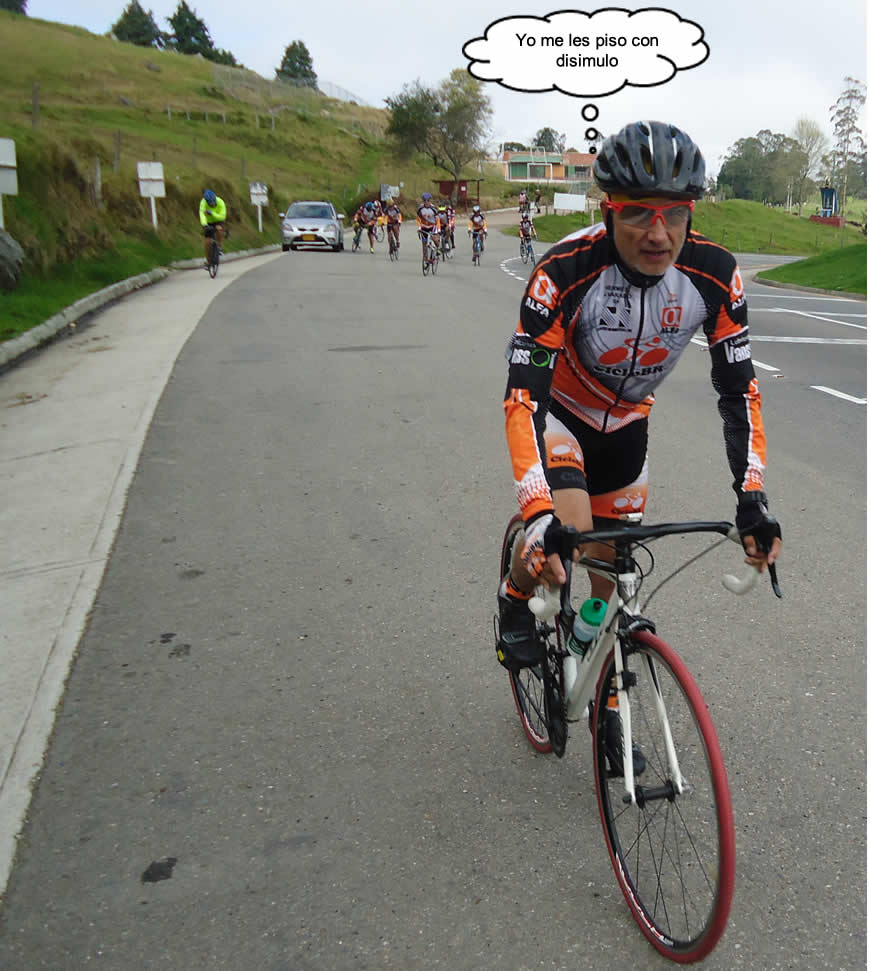 En qué estábamos, ya recuerdo, del Chuscal partimos los once pedalistas citados, los primeros metros planos los recorrimos a ritmo moderado, pero el amigo Hermes, un experto en esa ruta, apretó disimuladamente el paso como quien no quiere la cosa y se llevó a rueda a Geoffre, a William a Alberto, a Pablo y Molanito. Unos metros atrás íbamos Víctor, Pulga, Eduardo, Melki, y O. Márquez.