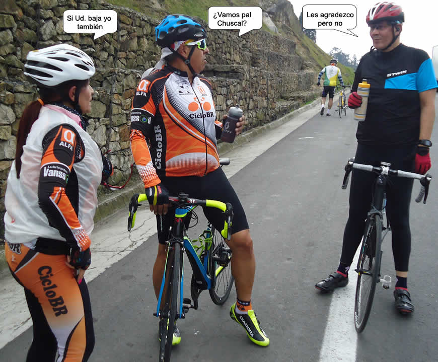 Descansaron un poco y pa´rriba se dijo, les tocó hacer los 20 kmts de subida solos, su “partner” Eduardo tampoco quiso acompañarlos, “No Chinos yo por allá no voy ni puel p..tas no tengo gasolina". No hay derecho, nos van a entutelar por discriminar a los europeos.