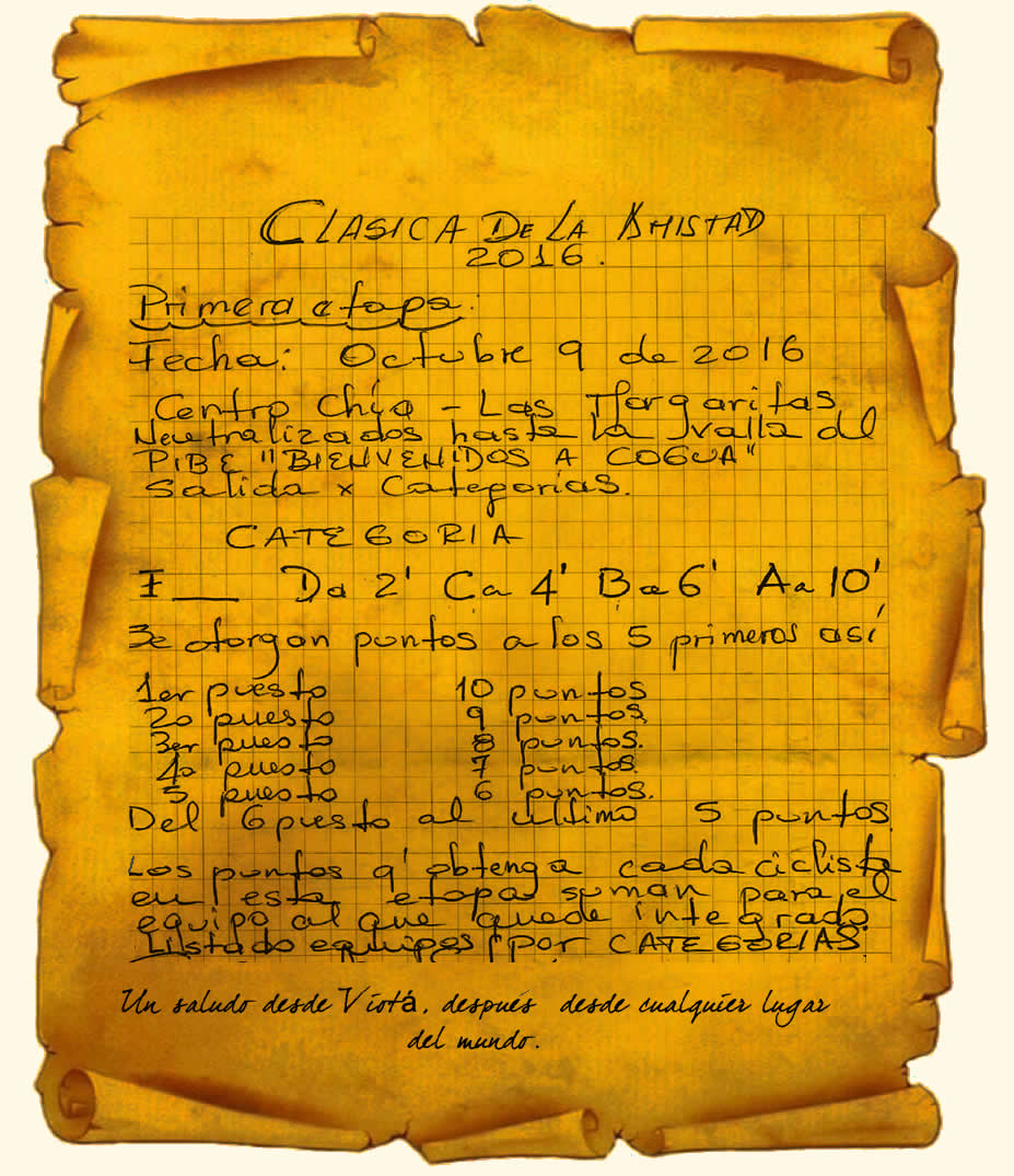 El grupo GP (González - Pulgarín) ha seguido trabajando duro en la orgaización de la Clásica de la Amistad, informaron que en estos días tuvieron un segundo debate y decidieron hacer algunos ajustes a la lista de equipos y a la programación de las etapas. Me enviaron otro manuscrito de puño y letra de la Sra Nobile, así que para evitar que me acusen de modificar o tergiversar las importantes decisiones del GP, me limito a publicar una imagen fiel del pergamino, digo del Manuscrito.
