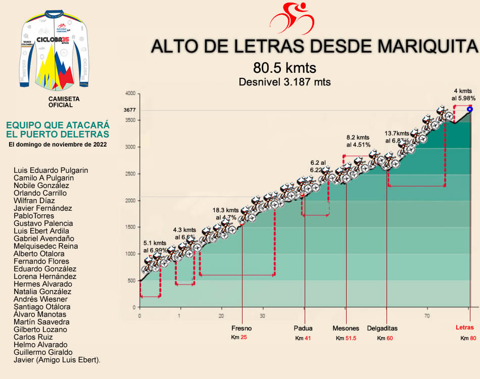 Les deseamos toda la suerte del mundo y éxitos en la travesía al equipo de 26 pedalistas que tiene como meta coronar este fin de semana el Alto de Letras. Buen tiempo y que la fuerza los acompañe para que todos puedan cumplir su meta. Pronto regreso. Esperamos que alguno de los asistentes nos envíe una resumen con el recuento de esa visita a Letras. El año pasado lo solicitamos y no salió a la palestra ningún cronista, por lo cual quedó el vacío en la serie histórica de crónicas de CicloBR..