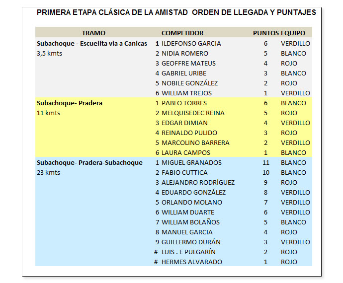 Los competidores en la vía a La Pradera convinieron en reducirle el alto de la Herradura y salir neutralizados hasta pasarlo. En el grupo de Subachoque a la Escuela, Nobile se encontró que tendría que competir contra Nidia, pues varios equipos decidieron ir por esos 6 punticos, era previsible que se jugaran cartas como esa. Estas fueron las posiciones y puntos obtenidos por los competidores: