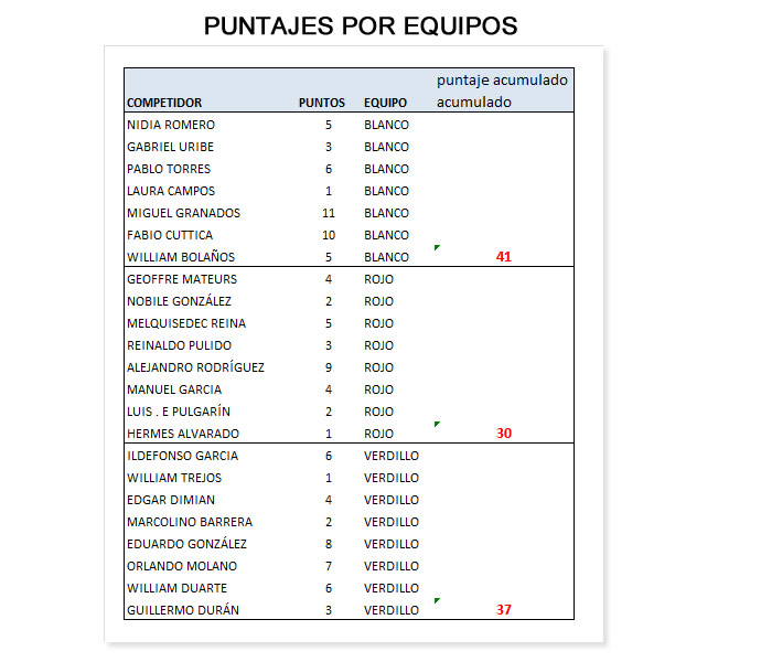 Este imprevisto nos obligó a cancelar el tramo a Canicas y por supuesto los puntajes acumulados se “despelotaron” dado que allí estaban en juego 55 puntos. Varios equipos le habían apostado a ganar ese tramo. Los cuatro recorridos estaban interrelacionados, fue como quitar una columna estructural, el edificio o se cae o queda mal y esto último ocurrió hoy. El más afectado fue el equipo rojo. Veamos el consolidado de puntajes: