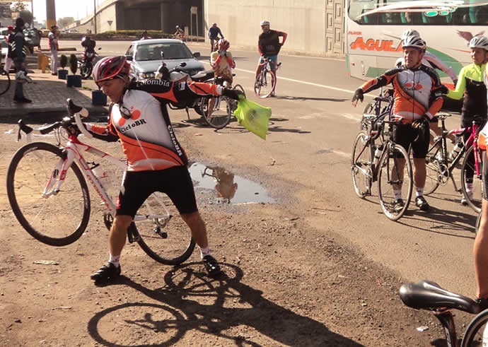 8:10 a.m., todos listos en el punto de salida, excepto el monito Trejos, decidió llevar su bici al mecánico ambulante que se ubica en la Bomba de Siberia justo antes de salir. estaba pinchado desde ayer. Por supuesto tuvo que perseguir con la ayuda de sus compañeros.