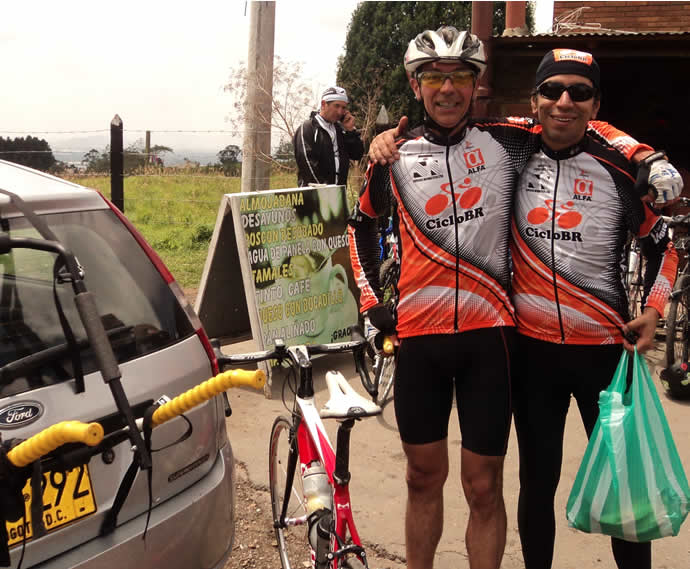 Le correspondía el turno como conductor elegido a Mauricio Ordóñez, quien decidió madrugar y hacer previamente su entrenamiento. Llegó justo cuando acabábamos de partir, con bananos y mandarinas que repartió en el Alto del Vino. Adicionalmente William Duarte, quien no tiene vehículo, decidió colaborar con sus compañeros llevando los refrigerios, trajo bananos y Bolsita energética con bocadillo, galletas y maní para cada pedalista.