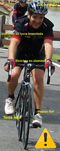 Esta vez Alejandro no pudo hacer sus habituales jalonazos ni participó en la final, pues parece que sufrió un leve ataque de Alkaseltzer, como se puede comprobar en la foto y olvidó parte del equipo reglamentario para practicar el ciclismo, vean a ver si descubren qué le faltó.