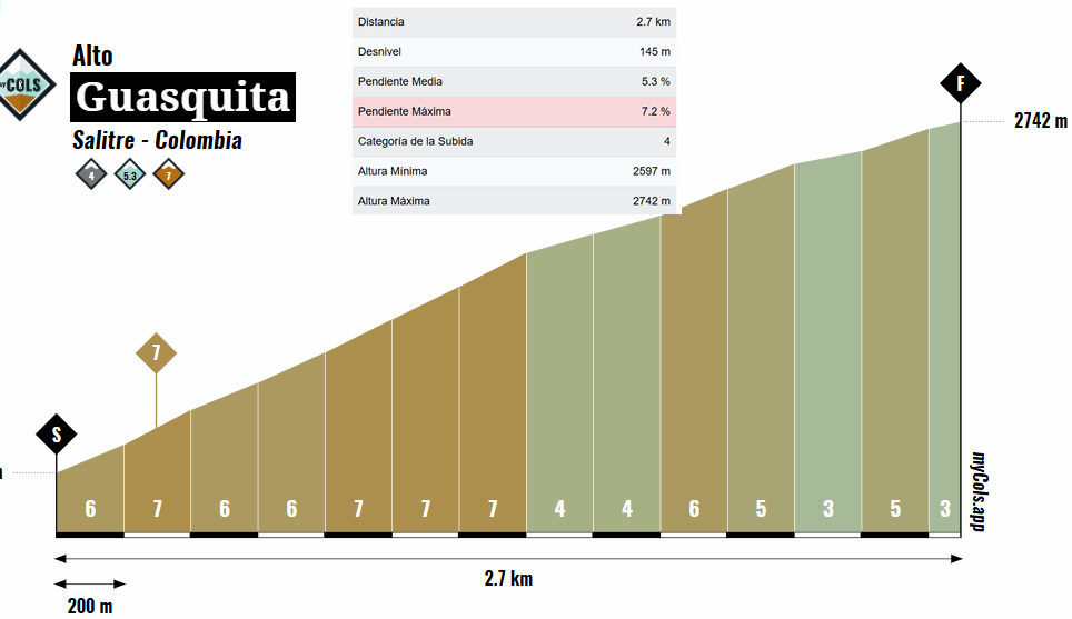 Esta subida que antes conocíamos como El Salitre, es como una cuchilla de Guasca en miniatura, pues las pendientes medias y máximas son muy similares, solo que la distancia es de solo 2,7 kmts, suficientes para calentar piernas y acelerar el corazón.