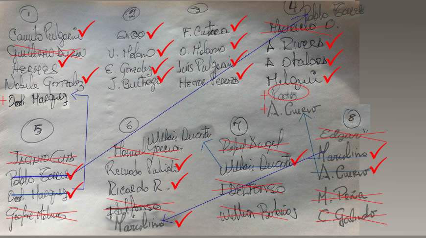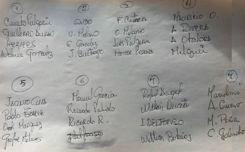 Durante el camino al peaje Eduardo el Chinazo iba preguntando si fulanito o zutanito habían llegado, mientras pensaba en la forma de cuadrar los equipos. Paramos y acto seguido pidió a su asistente Pablito que le leyera nuevamente la hojita en la cual con su puño y letra había diseñado los conjuntos.