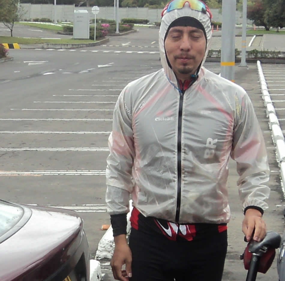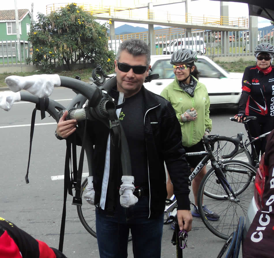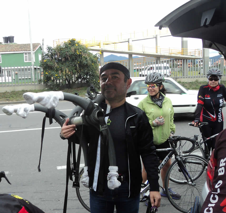 Muy temprano me dijeron que Carlos Galindo, el conductor elegido de la fecha había enviado un mensaje informando que no llegaría, nos había salido “calceto”, se decía de todo del pobre: que era el colmo, que cómo no avisó que no podía llegar, que de pronto era una de sus bromas y que se nos aparecería en el Alto del Zipa, en fin, me imagino que tenía rojitas las orejas. Pero todo eran habladurías de sus contradictores, cuando salimos de Centro Chía lo fotografiaron, venía ataviado con una elegante chaqueta negra de marca cargando un portabicicletas, frente a la que parecía ser su nuevo auto, una camioneta plateada nuevecita en cuyo baúl abierto se veían deliciosos bananos, bocadillos y ponquecitos, en unas bolsas, ubicadas en el baúl abierto.