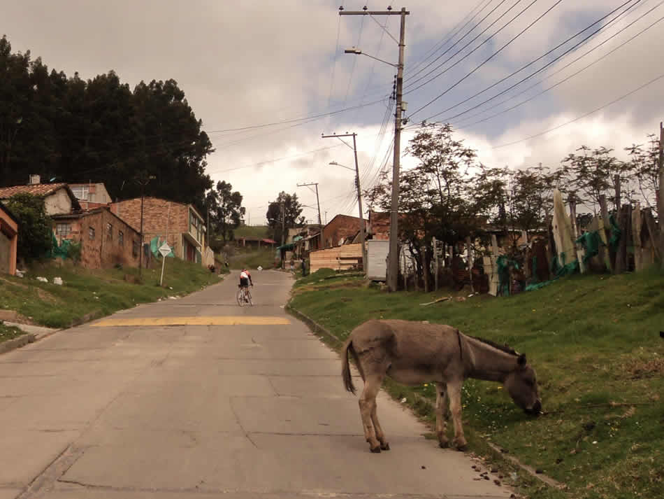 Cuando el lugareño le indicó a Javi el camino, seguramente el no percibió la sonrisita pícara, del gracioso que lo envió a sufrir. Justo ayer yo les había enviado por Whatsapp la descripción que hacen de esa variante para llegar a la vía que lleva al alto del Zipa los amigos de Altimetrías de Colombia, allí señalaban: "Este alto tiene una variante durísima, con un kilómetro inicial brutal al 13.5% de pendiente media a la salida de Zipaquirá por la Calle 4, y rampas con picos de hasta el 20%.". Imagínense, mientras nosotros avanzábamos por curvas con pendientes duras del 6.5% y 7% el pobre Javi se reventaba subiendo esa pared. Si me toca a mí me habría devuelto a Bogotá de una”. |