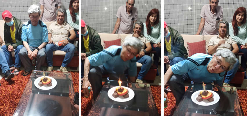 Antes de retirarnos a nuestros aposentos, aprovechamos para celebrarle el cumpleaños a Alberto con una deliciosa torta que improvisamos a partir de una bolsa de mini chocoramos, y un brazo de reina o liberal; Wilfran pidió prestadas unas ramitas de paja de un florero de la señora Marilú, esposa de Orlando y con eso Alberto pudo soplar, por un ladito para no quemarse las canas, al momento de cantarle el happy birthday, mientras sonaban los voladores y los aplausos ..