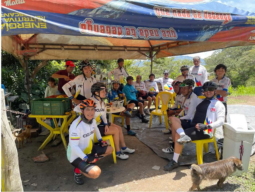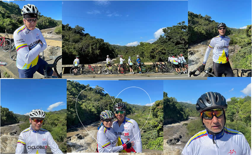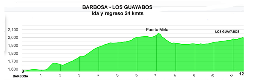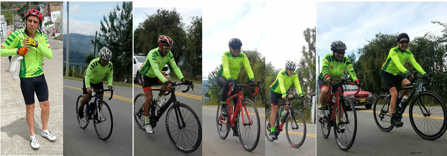 Una carretera preciosa, muy bien pavimentada, y con una pendiente manejable, pero sin descansos, teníamos que llegar inicialmente al alto llamado Puerto Mirla ubicado a 7 kmts. Y luego descender otros cinco para llegar a los Guayabos. Disfrutamos y sufrimos la subida, pero se coronó. Lorena acompañó todo el camino a Martín con la escolta de Carol. Lily se había regresado a Barbosa para cumplir un compromiso, Fernando tuvo entonces que medirse con otros competidores, le quedó tiempo hasta para contar historias en carretera