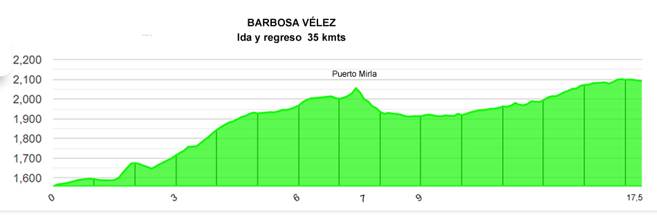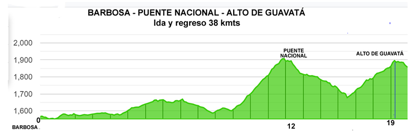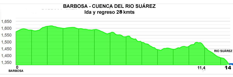 Todo listo, nos aprestamos para iniciar la primera etapa del recorrido programado para el “ciclo paseo”. Un primer segmento que nos llevaría de Barbosa al rio Suárez, 14 kmts de ida y 14 de regreso, con el siguiente perfil montañoso: