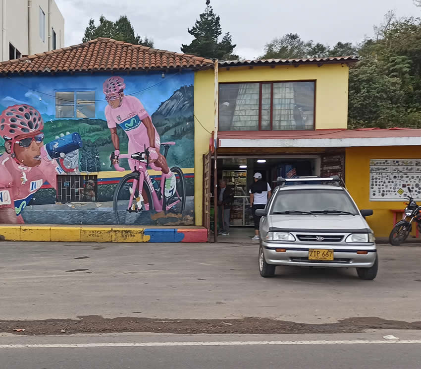 Unos kilómetros más adelante ya sobre la vía a Bucaramanga, nos encontramos con una casita amarilla y un gran mural en homenaje a Nairo Quintana, al lado una pequeña tienda, nos cuentan que allí atiende don Luis Quintana padre del campeón y cuando llega Nairo a visitarlos es un acontecimiento en el negocito.