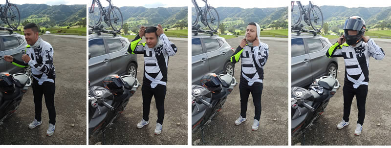 Gustavo había calculado que sería un soleado día por lo cual llevó solo una camisa de licra, le facilitamos una rompevientos de ciclismo que de algo le ayudó.