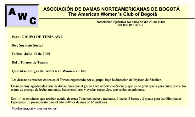El lunes 13 de julio del presente año, se tenía previsto un Torneo de Tenis en el Club Ingles (camino a Cota) organizado por las. Nuestra compañera tenista y amiga Myriam de Sánchez, se encargó del diseño de toda la logística de este certamen y también de recoger los fondos para las diferentes obras sociales que impulsan el grupo de Damas Americanas. La cuota sugerida para participar fue de $30.000 pesitos por jugadora y se logró adicionalmente el patrocinio del Club Residencial Vivenza.