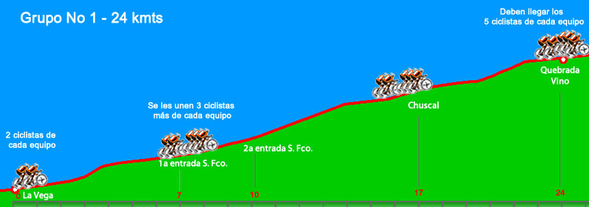 a) Grupo No 1: cinco (5) ciclistas de cada equipo que hacen el recorrido La Vega- Quebrada de El Vino (dos desde la Vega y tres que se suman al grupo en la 1a entrada a San Francisco.