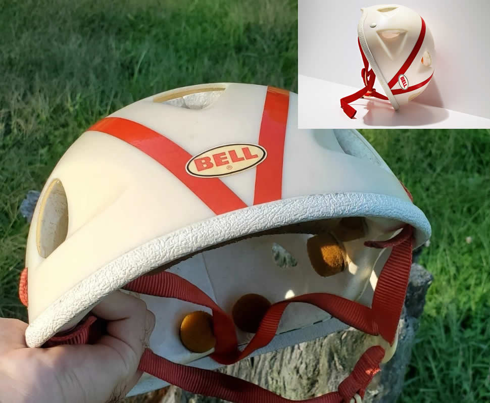 Yo tuve uno de esos cascos de tiras con los colores verde y rojo, marca Cinelli pero lamentablemente no lo guardé, hubiera sido un tesoro, como lo son los infladores que se colocaban debajo de la barra horizontal del marco o los pedales de canastilla.
