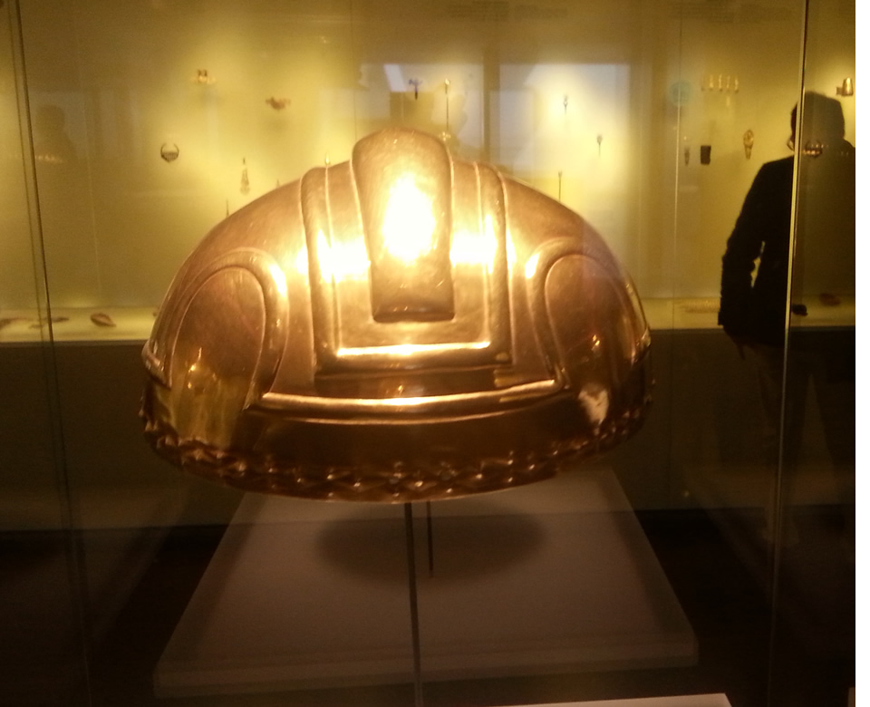 Hablando de cascos sin respiraderos, en una visita al Museo del Oro de Bogotá, ví un ornamento de puro oro perteneciente al tesoro Quimbaya, me llamó la atención y le tomé una foto, por cuanto parece un casco de ciclismo. Tal vez por esa razón Melki adoraba su casco, pareciera que Giro se inspiró en nuestros antepasados.