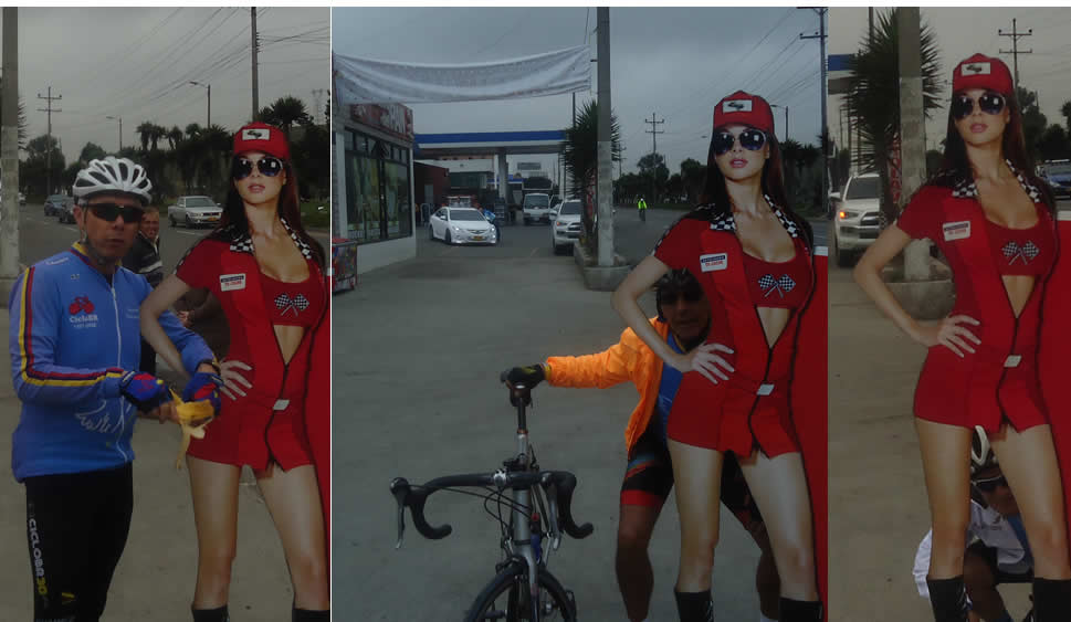 Nos ubicamos en grupo para tomar la tradicional foto al lado de una preciosa damita en minifalda que parecía encantada con nosotros pues aceptó posar con varios ciclistas sin molestarse; desafortunadamente la foto del grupo que tomó el conductor de Guillermo no salió, no oprimió el obturador, asi que nos tocó quedarnos con estas tomadas unos minutos antes donde por fortuna quedó la chica encantadora que ya tiene preaprobado su ingreso para cuando aprenda a montar en bici, o antes si ella lo prefiere, en la adminsitración de CicloBR hay mucho que hacer, por ejemplo sería una excelente ayuda para Pulga como vendedora en la Ciclo tienda, tal vez así Fabio y Giaco decidan hacer más compras, o tal vez un buena cobradora para la tesoreria, o una excelente copiloto para los conductores elegidos como lo demuestra con su atuendo