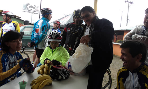 Melquisedec, nuestro conductor elegido, estaba un poco triste pues ayer con Marthica habían pasado varias horas, primero en el supermercado y luego en su apartamento empacando los refrigerios para sus compañeros. Una bolsita para cada uno con Tumecitos y deliciosos herpos y como complemento la dosis de potasio para evitar los calambres, fresquecitos bananos. Definitivamente, estos son los detalles que nos distinguen de otros grupos de ciclismo. Mil gracias a los Reina por su generoso aporte a sus compañeros