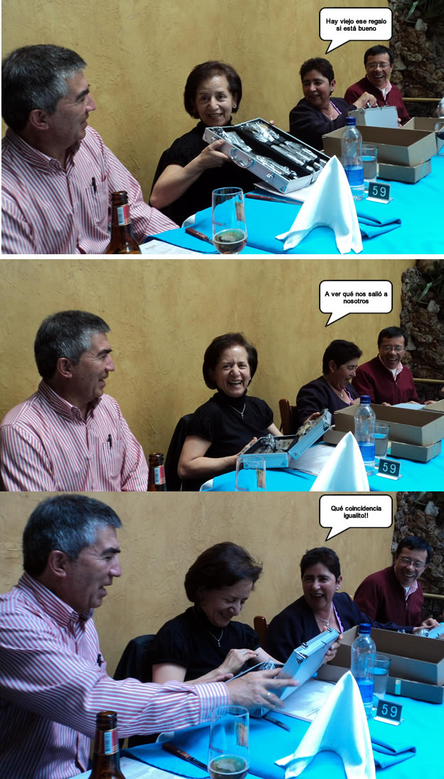 Alfredito Santacruz y Daniel Andrés Forero se volaron de la oficina (Dios, que en la Dian no lean esta nota) e hicieron presencia por algunos minutos, como un especial detalle con sus amigos. En nombre de todos les hicimos entrega a cada familia de un práctico estuche metálico para BarBQ, con todos los elementos para un asado. Incluía un raspador, para que en la próxima visita, el poeta no les dañe mucho la ollita del arroz.