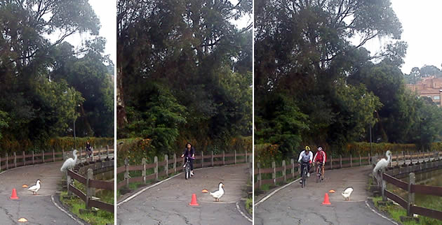 Afortunadamente se trata de patos blancos domésticos que se criaron en el lago del Centro Deportivo Choquenzá, cuyo nombre científico es Anas platyrhynchos domesticus. Como se aprecia en la gráfica captada esta semana en la cicloruta, han cogido una confianza enorme con los ciclistas, pues ya nos ven como parte del paisaje y ni siquiera se inmutan.
