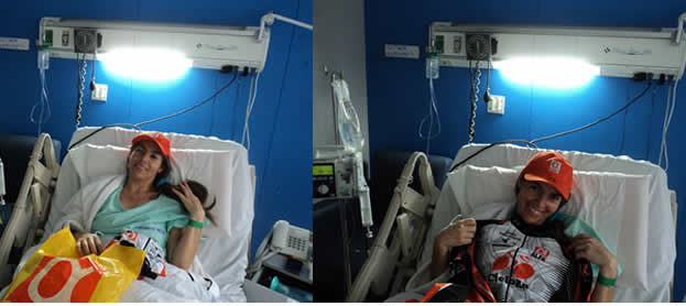 Un reportero de CicloBR la visitó en la Clínica Reina Sofía. La encontramos en plena recuperación, eso si muy frustrada por no haber podido darle palo a más de uno en Icononzo con su nueva bici, pero agradecida con el Gran Jefe de arriba por haberle permitido seguir