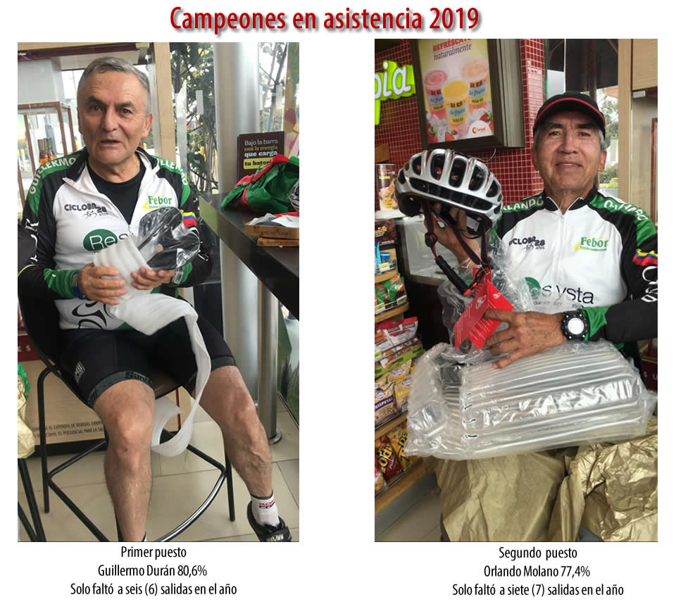 Allí nos hicieron entrega de sendas bonitas billeteras a quienes no habíamos podido asistir a la reunión de despedida. A Guillermo y al suscrito nos premiaron con un sillín en carbono y un casco respectivamente, por haber sido los de mejor asistencia del año anterior, junto con Pablito, Mención de Honor, quien solo faltó a 8 salidas dominicales. Muchas gracias.