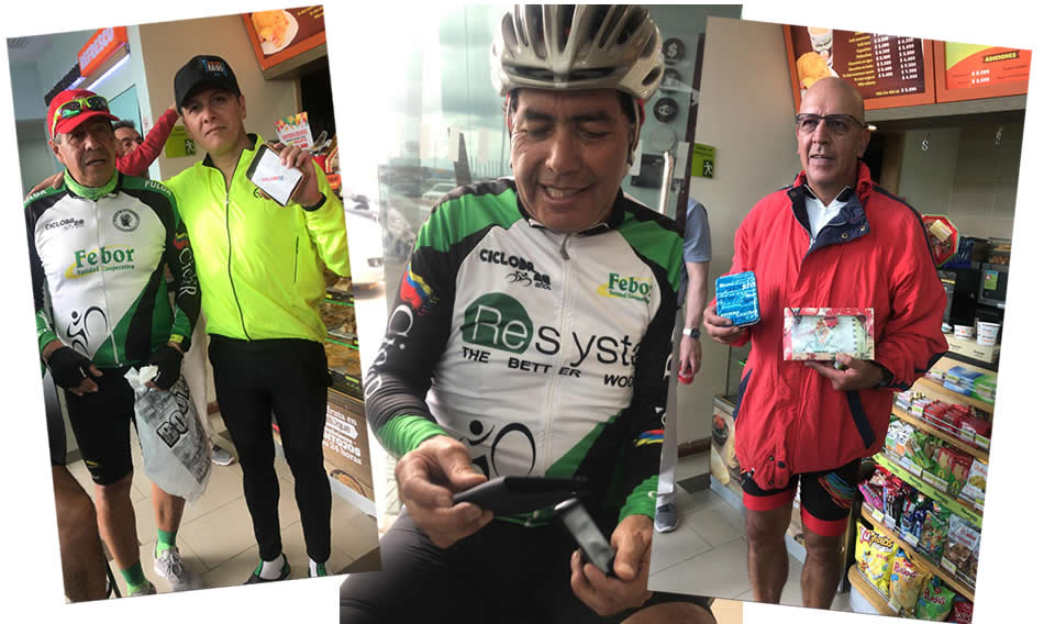 Como siempre, la vía llena de ciclistas, marchamos a buen ritmo y en grupo, sin tener muy claro el sitio de llegada. Llegando al cruce de Puente de Piedra, se escucharon voces de atrás: - “sigamos hasta el Vino”, y dicho y hecho, continuamos por la vía directa hacia el famoso alto. Emprendimos la subida y en la mitad del recorrido cada uno le iba tomando su sabor al Vino, para los que no han parado de practicar lo notaban dulcesito, con ganas de repetir, en cambio para otros nos pareció agrio. De todas maneras fue bueno probarlo. Al culminar el ascenso, Nóbile, Alvarito y el noble Pulguita, decidieron dar media vuelta hacia Siberia. Allí tuvieron que esperar largo rato a sus compañeros. Los demás nos antojamos de los deliciosos “pandebonos” y fuimos a buscarlos hasta la quebrada. Ya llegando a este sitio, Pablito, que bajaba en la parte de atrás, perdió el aire de su rueda delantera y paró desconsolado porque no tenía inflador, pero con la suerte que a otro ciclista que iba más atrás, le pasó lo mismo en el mismo sitio y este lo auxilió.