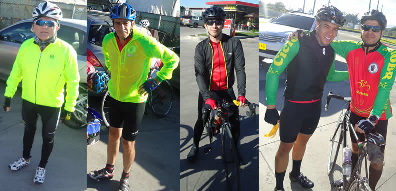 Llegando al peaje de Siberia, nos alcanzó Alberto Rivera y luego David, ellos se habían adelantado al grupo A dado que no pararon en Subachoque. Llegando a Siberia Alberto le “picó” a Marcolino y se llevó su sorpresa, el veterano en estas lides Maquito abrió los flaps (codos y rodillas) y le ganó en franca lid. En Siberia estaban Pacho y Andrés esperándonos desde hace un buen tiempo, Andrés había dejado su maletin y los tenis en mi carro pero tenía un compromisp, asi que le encargó la bici a Pacho y salió a buscar una flota con destino a Bogotá, con casco, disfrazado de ciclista y en zapatillas, seguramente los pasajeros se imaginaron que le habían robado la bici al ´pobre "gringo".