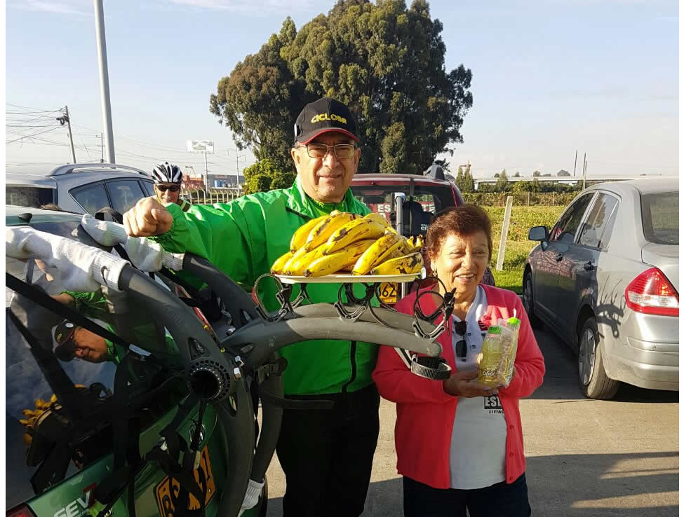 Por último, un agradecimiento muy especial a don Héctor Pedraza y a su señora esposa, María Sagrario Bernal, quienes sacrificaron hoy su jornada dominical para servirle al grupo de ciclistas como “carro acompañante”, lo cual hicieron con gran lujo, pues se presentaron muy temprano al congestionado sitio de encuentro, con sus paquetes muy organizados y conteniendo un equilibrado menú con bocadillos, jugos, galletas, barritas Jet, maní y unos deliciosos bananos. A ellos nuestro profundo agradecimiento!. En Subachoque fueron tentados por las delicias de Pajarilla y se quedaron acompañando a Alberto y William, mientras el Grupo concluía sin escolta la etapa por la vía de Subachoque - Puente Piedra debido a que no sabian del cambio de la ruta.