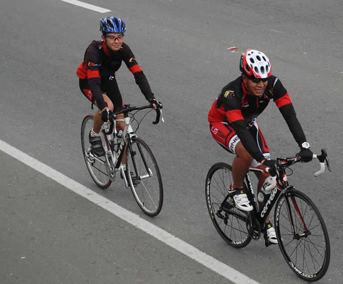 Los primeros 10 kmts hasta Puente Piedra sirvieron de calentamiento, al girar hacia Subachoque ya asomaban alguna goticas de sudor en nuestras frente y los músculos de las piernas estaban a punto. Nos reagrupamos en Puente Piedra y luego bajo el comando de Carlos Reina, Reinaldo, Alejo y Gabriel nos dedicamos juiciosos a “enrollar cadena” hasta que tuvimos a la vista el repecho de La Virgen, primera prueba para ver qué tan calienticos estábamos.