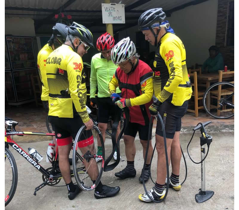Ya sin el rio a la vista, hacemos la segunda parte del descenso. A los pocos metros Orlando Carrillo reporta pinchazo, Wilfran le lleva la cuenta y dice que es la sexta vez y en la misma rueda. Como de costumbre la solidaridad aflora y el Comité de Pinchazo comienza a operar, esta vez comandado por el sabio de la tribu.