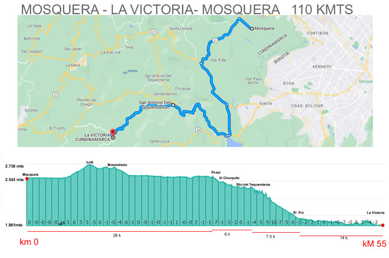 Los demás conocíamos la ruta a La Victoria pues ya la habíamos recorrido en tres oportunidades: en , , y . Siempre salíamos desde Siberia, pero esta vez partimos de Mosquera, con lo cual nos ahorramos 20 kmts. Guillermo nos recomendó el parqueadero público El Gato en esa población.