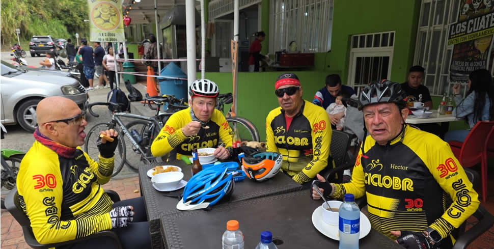 En la panadería del parque principal nos esperaba un desayuno de campeones: arroz con huevo, caldo, pan y café caliente. Foto obligada, bromas sobre piernas y listos para el regreso, 13 kilometros suaves al paso de Cariño y Javier Fernandez.