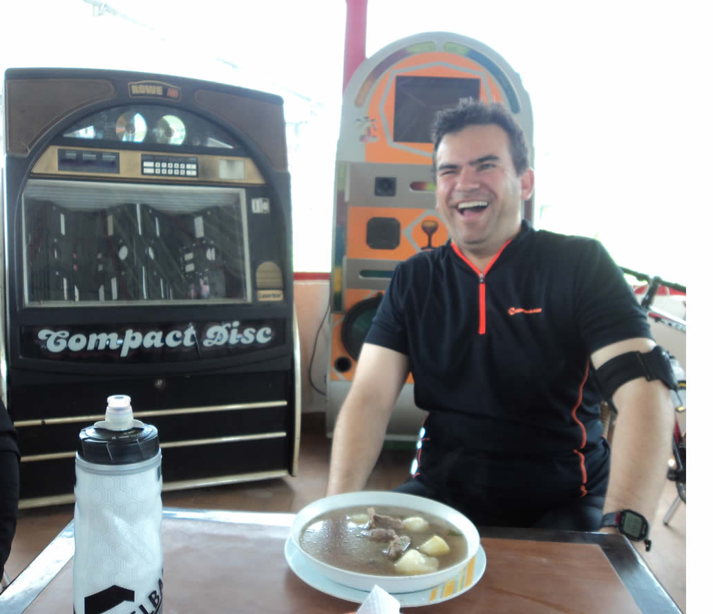 Traduciendo el primer párrafo, al lenguaje de nosotros los mortales, con el perdón de mi tocayo: Hoy nuevamente acá disfrutando de otro día de ciclismo, en compañía de 15 amigos ( que se le midieron hoy a aplicarse una nueva dosis de bici para completar la tarea de un largo fin de semana.