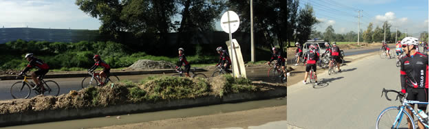 Con precaución el lote surcó la congestionada vía y en minutos llegamos al cruce que nos conduciría a Zipacón, donde completamos 28 kmts de recorrido. Como cosa rara hoy los duros estaban de un querido subido, pues todos pararon para esperar a que llegaran los que se habían relegado. Atrás venían Miguel y Pulga quienes tuvieron que devolverse para coordinar con el conductor de la camioneta acompañante pues la vial no la dejó pasar dado que en ese momento estaban pendientes de un accidente en la vía. En la parada nos enteramos que Mauricio y William habían pinchado y que Pulga y Miguel los auxiliaron. Pese a la buena voluntad, no pudieron despinchar a William, así que lo “montaron” en un bus que lo llevaría al cruce dónde lo esperábamos.
