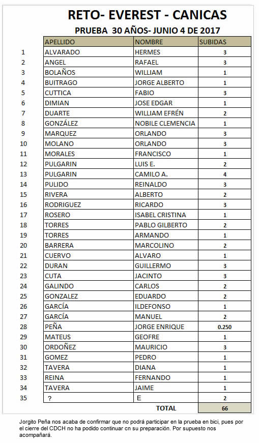 Esa planilla es meramente tentativa, la ajustaremos el domingo 4 de junio, consultando a todos los ciclistas participantes. Es decir quien quiera hacer más subidas no hay problema, se le acepta, ni más faltaba y por supuesto quien quiera hacer menos o solo quedarse degustando la polita mientras otros montan, también se la valemos. Ojalá superemos la meta de las 66 subidas, si no pues no pasa nada.