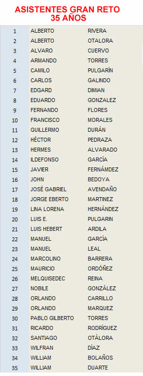 No se trata de una competencia individual, es un reto personal para llegar a la meta que cada uno se proponga, según su estado físico y condiciones actuales, la idea es cumplir el reto, no importa el orden de llegada. De acuerdo con las llamadas que ha efectuado Nobile, al parecer contaremos con 36 pedalistas que se le medirán al reto, esta es la lista de asistentes, si Ud. no se encuentra inscrito, por favor comuníquese con Nobile, igualmente si no puede asistir.