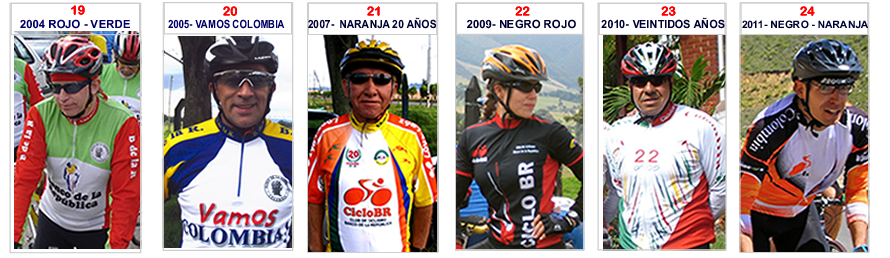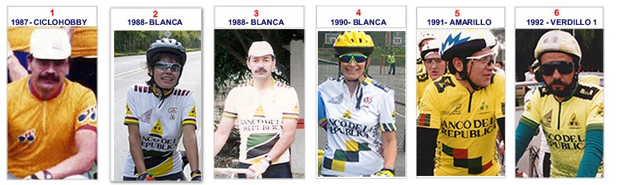 Discúlpenos  por divagar en la historia, pero la idea de este resumen era responder a la pregunta planteada arriba en el título, para el efecto, hicimos una recopilación gráfica con imágenes de las diferentes camisetas que hemos lucido orgullosos en estos 35 años de vida deportiva como familia ciclística. La respuesta a la pregunta la encontrarán en las siguientes gráficas, los invito a que hagamos una regresión o viaje hacia el pasado, comenzando en 1987, repasando los  colores y diseños que nos identificaron en carretera: