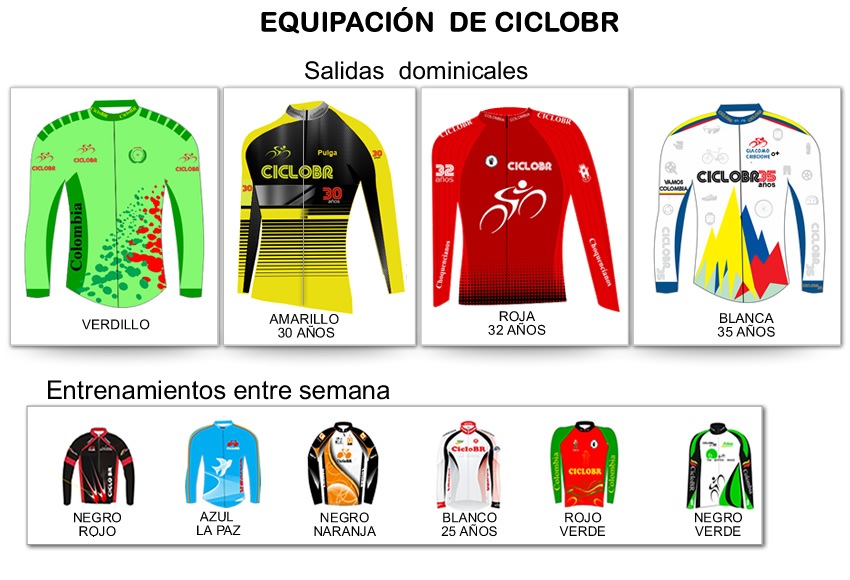 Los asociados que sean aceptados como afiliados a CicloBR deben contar con esas cuatro camisetas para las salidas dominicales; es un requisito de seguridad en carretera, las cuales se pueden adquirir en la Tienda de CicloBR que gerencia Luis Eduardo Pulgarín, o con el proveedor que escojan, siempre y cuando sea el mismo diseño.