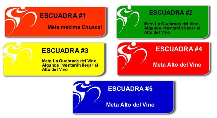 Cada equipo o  escuadra tendrá un capitán, quien será el encargado de motivar a sus compañeros para que concluyan el reto, entre cada equipo habrá una diferencia de tiempo a la salida, para que no se mezclen y suban tranquilos, y con seguridad. No obstante, quien quiera dar por terminada su tarea antes de la meta trazada puede poner pie en tierra y subirse a uno de los carros acompañantes. Tendremos un premio especial para las escuadras que lleguen completas al reto propuesto.