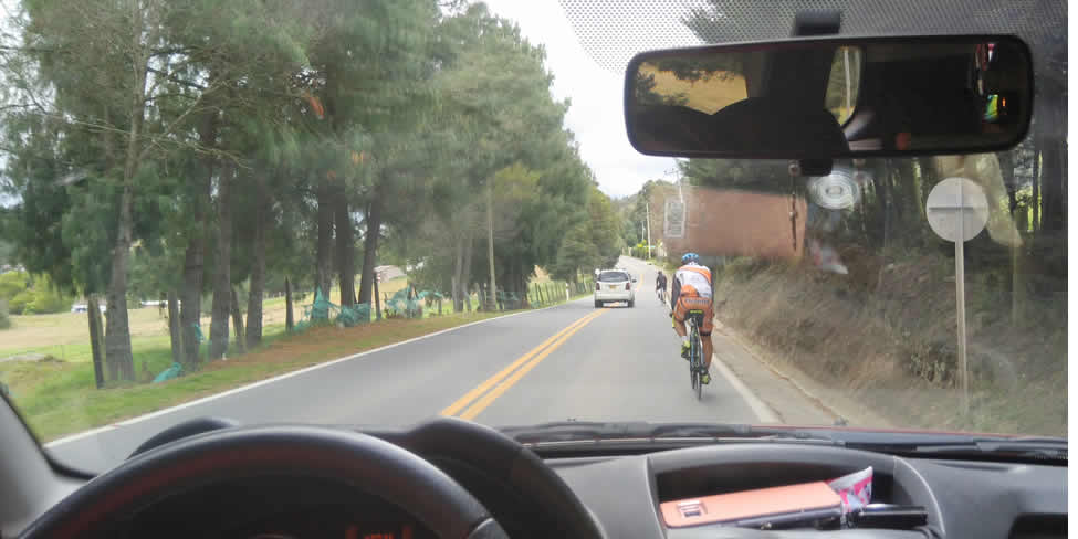 Pese a que “no se veía ni hablar”, Giaco y el Chinazo reclamaban que en la programación se señalaba que al concluir Guasca bajaríamos unos kmts hacia Sueva, pero el resto de pedalistas se negaba a continuar por la falta de visibilidad. Finalmente Camilo hizo una propuesta conciliadora: “Giaco- mejor bajemos y vamos a Guatavita”, esto los convenció y nos salvamos de una cita a ciegas por la via a Sueva, así que iniciamos el descenso hacia la población Guasca.