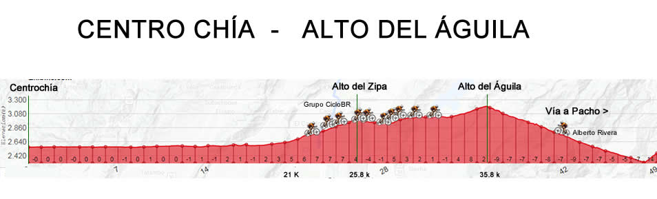 Este tramo del Zipa al Águila tiene once kmts debemos ascender de los 2984 a 3185 msnm, pero la ventaja es que no todo es acenso parejo, pues hay bastantes repechos con bajadas que nos permiten descansar, hasta un largo descenso de medio kilómetro en donde el plato grande ayuda a devorar la distancia antes de llegar a los tres kmts finales que, si son de ascenso sin ningún descanso, con desnivel del 9,5% al final.