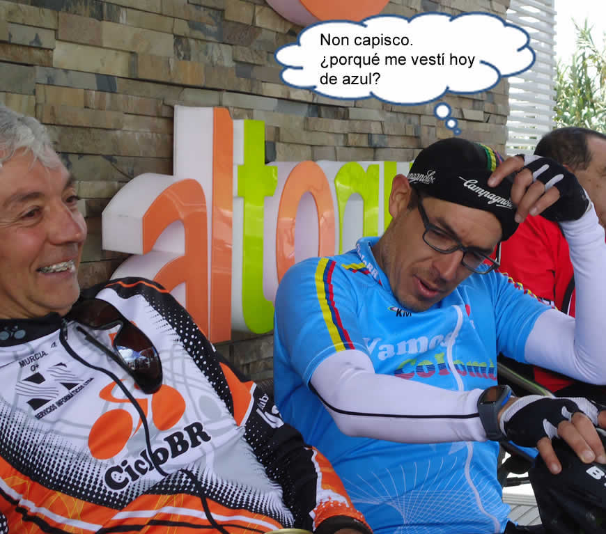 Nos acompañó en su vehículo Ricardo, venga les cuento la que le pasó hoy, también tuvo un día difícil. Pasadas las seis de la mañana buscó sus implementos, recordó que la semana pasada había leído en la programación que hoy tocaba la camiseta Negro Naranja pero no estaba seguro, montó la bici en el auto y cuando estaba a punto de partir decidió revisar la programación, tenía razón era la naranja, pero entonces descubrió con angustia que hoy tenía turno de conductor,” …erda”, que vaina lo primero que se le ocurrió fue pasar por la plaza de mercado de Fontibón, le queda cerca, allí compraría unos gajos de buenos bananos y otras fruticas para sus compañeros. Pero la plaza hoy estaba cerrada, me llamó angustiado, le dije que no se preocupara que lo importante era su acompañamiento. Pero el León del Tolima no se dio por vencido, se fue buscando en el camino hasta que encontró un supermercado abierto, allí hizo un mercadito de galletas, bocadillos y juguitos de caja. Oiga Richard Ud. es un bacán qué ejemplo de solidaridad con sus compañeros, anótese 100 puntos. Que Dios le pague, nosotros andamos cortos de billete.