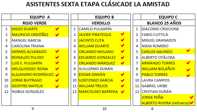 Seguro que como siempre la conformación de los equipos generará inconformidades, pero debemos tener en cuenta que se trata de divertirnos, finalmente por más cambios que se hagan alguien quedará inconforme, pero tranquilos que como siempre todos ganan premios. Lo más importante es que estemos seguros de que se logre comprometer a los integrantes de las diferentes escuadras para que asistan, pues el grupo GP conformó 7 de 5 pedalistas cada una y la inasistencia de dos o más ciclistas puede hacer que alguna se desintegre.